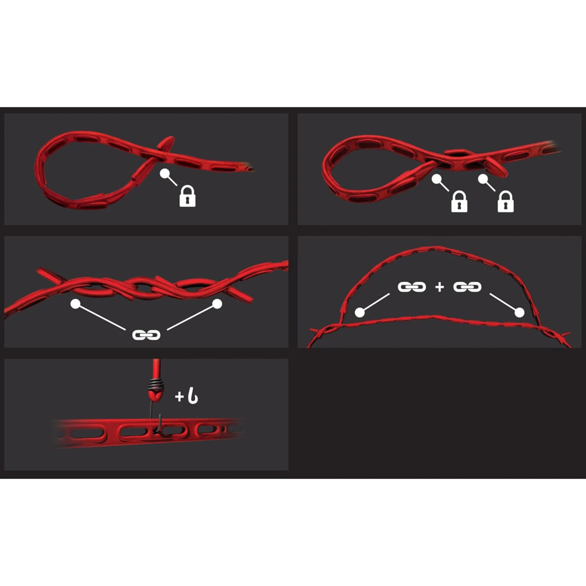 Tento popruh vám poskytuje neobmedzené možnosti upevnenia. Môžete ho obtočiť, previazať alebo prevliecť okolo rámov, rúrok, konštrukcií či nepravidelných predmetov – podľa aktuálnej potreby a prostredia.